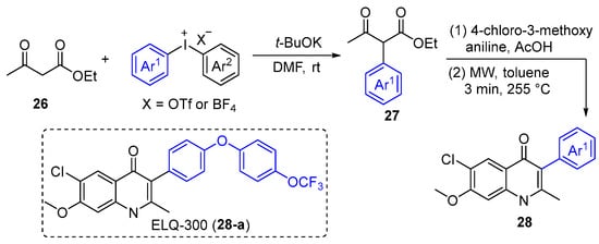 In 2015, Manetsch and co-workers [70] demonstrated metal-free α-arylation of ethyl acetoacetate (26) using diaryliodonium triflates under ambient conditions. Whereas electron-donating/withdrawing substituents (excluding 4-methoxy groups) delivered moderate yields of α-arylated adducts, sterically encumbered systems (e.g., mesityl iodonium salts) proved substantially less competent. This methodology enabled the key arylation step in the synthesis of the antimalarial lead compound ELQ-300 (28-a), further demonstrating the promising utility of diaryliodonium salts as arylating agents (Scheme 14).