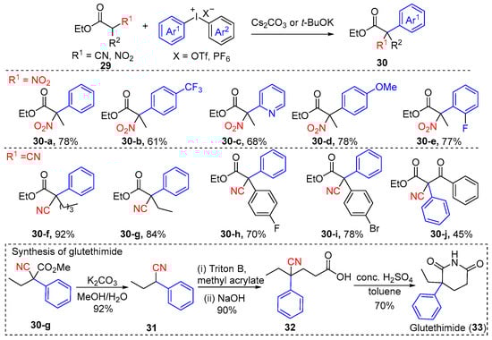 Subsequently, researchers expanded the substrate scope from dicarbonyl compounds to monocarbonyl compounds bearing ester groups with electron-withdrawing groups at the α-position. In 2015, Olofsson’s group [71] developed an efficient, direct, and metal-free approach to achieve the α-arylation of α-nitro esters. This transformation requires stoichiometric amounts of nitro esters and diaryliodonium salts, affording α-substituted nitro esters (30-a–30-e) in moderate-to-good yields with broad functional group tolerance. In 2016, Han and Wang et al. [72] developed a transition metal-free direct arylation of 2-substituted cyanoacetates with diaryliodonium salts. The synthetic methodology was successfully extended to substrates bearing diverse functional groups, enabling the preparation of various 2-substituted α-arylacetonitriles (30-f–30-j) in good yields. These compounds serve as valuable chemical intermediates for medicinal research. Significantly, the effective application of this method afforded streamlined access to glutethimide (33), a therapeutically relevant compound exhibiting neuroparalytic, immunomodulatory, and anticancer activities—thereby demonstrating its strategic utility in complex molecule synthesis. (Scheme 15).