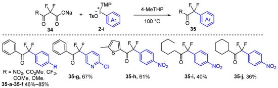 In 2023, Kikushima et al. [73] reported catalyst-free decarboxylative arylation reaction employing α, α-difluoro-β-ketoesters (34) as substrates and diaryliodonium salts (2-i) as arylating reagents. This reaction can be applied to the synthesis of diverse α, α-difluoromethyl ketone derivatives (35) (Scheme 16). The synthetic significance of this reaction is twofold: it not only resides in the capacity of the α,α-difluoromethyl ketone group within the synthesized products to be converted into esters, amides, and difluoromethyl motifs prevalent in biologically active compounds, but concurrently establishes an environmentally benign methodology for constructing fluorinated pharmaceuticals and functional molecules.