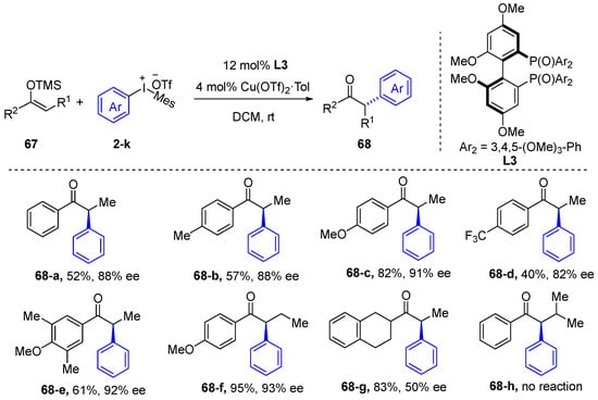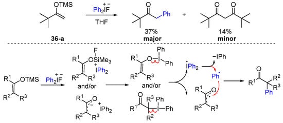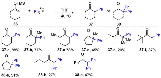 Koser’s group [74] investigated the α-phenylation of silyl enol ethers (36) using fluorinated diphenyliodonium salts (DIF). This reaction afforded α-phenyl ketones (37) or α, α-diphenyl ketones (38) in yields ranging from 20% to 88% (Scheme 17). During this study, the group examined the influence of kinetic and thermodynamic factors on regioselectivity. Their findings demonstrated that regioselectivity in α-phenylation can be controlled through appropriate condition selection.