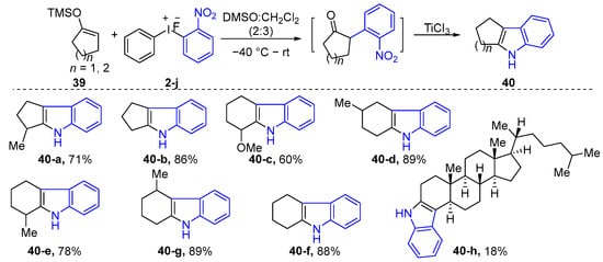 In 1999, Rawal and co-workers [75] developed a controlled synthetic approach for carbocyclic-fused indoles (Scheme 19). This strategy commenced with the regioselective α-arylation of a silyl enol ether (38) using an o-nitrobenzene-substituted phenyliodonium salt (NPIF, 2-j). Subsequently, the resulting nitro compound underwent TiCl3-mediated reduction. The generated aniline intermediate then spontaneously condensed with the adjacent ketone functionality. This efficient two-step sequence ultimately afforded a series of indole derivatives (39).