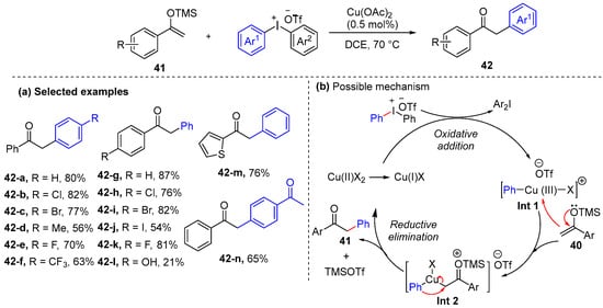 In 2021, Taillefer and co-workers [76] reported a ligand-free and base-free Cu-catalyzed protocol for the α-arylation of arylketone-derived enolsilanes (Scheme 20). This methodology employed ketone-derived silyl enol ethers (41) as substrates paired with symmetric diaryliodonium salts or unsymmetric mesityl(phenyl)iodonium salts as arylating agents, achieving intermolecular C–C coupling under mild conditions, affording a series of aromatic ketone derivatives. (42) Critically, the ligand-free and base-free system exhibited broad functional group tolerance, accommodating sensitive moieties such as triflates and iodides (Scheme 20a).