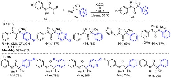 In 2020, Mohanan’s research group [77] reported a metal-free, mild, and efficient α-arylation reaction between diaryliodonium salts and α-nitro-fluoroacetamides (43) (Scheme 21). This reaction successfully utilized a broad range of diaryliodonium salts bearing sensitive functional groups and α-nitro-fluoroacetamides to synthesize α-arylated α-nitro-fluoroacetamide derivatives (44-a–44-k) in moderate-to-high yields. These compounds exhibit unique potential value due to their benzyl-fluorinated quaternary carbon stereocenters. Subsequently, the authors extended this methodology to α-cyano-α-fluoroacetamides with diaryliodonium salt under briefly optimized conditions, affording a series of α-aryl-α-cyano-α-fluoroacetamide derivatives (44-l–44-p). This approach exhibited excellent functional group tolerance and broad substrate scope, further highlighting the synthetic utility of the method.