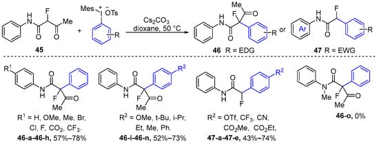 Concurrently, Taillefer’s group [78] reported a metal-free methodology for synthesizing α-arylated α-fluoroacetamides (Scheme 22). This approach leveraged unsymmetric diaryliodonium salts to arylate α-aceto-α-fluoroacetamide (45), affording tetrasubstituted α-aceto-α-fluoroacetate derivatives (46) in good yields. Notably, electron-deficient diaryliodonium salts triggered a spontaneous arylation/deacylation cascade, directly yielding α-arylated-α-fluoroacetamides (47). The protocol’s versatility was further demonstrated through a sequential base-mediated deacylation of arylated intermediates (46), enabling efficient access to diverse α-aryl-fluoroacetamides (47). This work significantly broadened the synthetic utility of unsymmetric diaryliodonium salts as modular arylating agents.