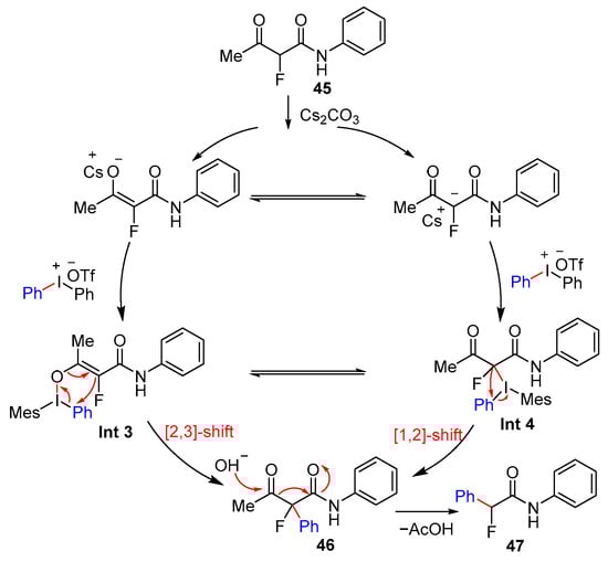 The authors proposed a plausible mechanism (Scheme 23): Deprotonation under basic conditions generates an enolate intermediate, which subsequently coordinates with the diaryliodonium salt via C–I or O–I bond formation to afford tricoordinated iodonium intermediates Int 3 and Int 4. These intermediates rapidly equilibrate, followed by characteristics [1,2]-ligand coupling or [2,3]-rearrangement to yield the arylated product (46). Finally, the electron-deficient aryl group enhances the electrophilicity of the fluorinated quaternary carbon center, facilitating base-mediated diacylation to deliver the deacylated product (47).