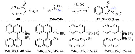 In 1999, Ochiai et al. [79] pioneered the synthesis of chiral diaryliodonium salts (2-l) via a BF3·Et2O-catalyzed tin-λ3-iodane exchange. Concurrently, the group developed an asymmetric α-phenylation of cyclic β-ketoesters (48) employing a chiral binaphthyl(phenyl)iodonium salt as the aryl source. This transformation afforded the corresponding products (49) in 34–53% yield with enantioselectivities ranging from 34% to 53% ee. This work highlighted the feasibility of asymmetric α-arylation using chiral diaryliodonium salts. Although reports on the asymmetric synthesis of chiral diaryliodonium salts remain scarce, this strategy provides a novel approach for asymmetric α-phenylation and significantly expands the synthetic utility of diaryliodonium salts (Scheme 24).