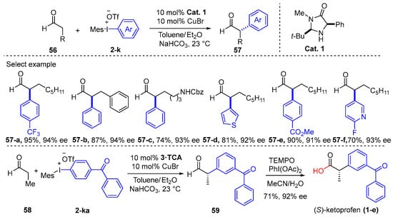 In 2011, MacMillan and co-workers [81] disclosed an enantioselective α-arylation of unactivated aldehydes (56) employing diaryliodonium salts as arylating agents. This transformation was achieved through a dual catalytic system comprising chiral amine catalyst TCA (Cat. 1, 10 mol%) and CuBr (10 mol%). This method achieved excellent yields (67–95%) and outstanding enantioselectivity (91–94% ee), delivering a series of α-chiral tertiary carbon-containing esters (57). These mild catalytic conditions provided a novel strategy for the enantioselective construction and retention of stereocenters at the enolizable α-formyl benzylic position. Furthermore, this group successfully applied this methodology as a key step to the rapid synthesis of (S)-ketoprofen (1-e), an oral topical analgesic (Scheme 26).