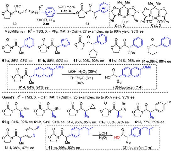 - Bigot, A.; Williamson, A.E.; Gaunt, M.J. Enantioselective α-arylation of N-acyloxazolidinones with copper(II)-bisoxazoline catalysts and diaryliodonium salts. J. Am. Chem. Soc. 2011, 133, 13778–13781. [Google Scholar] [CrossRef] [PubMed]