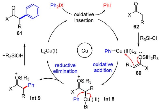 In this case, the authors proposed the following plausible reaction mechanism (Scheme 20b): First, a Cu(III) species (Int 1) is generated via oxidative addition of Cu(I) into the Ar–I bond of the diaryliodonium salt. Subsequently, the key intermediate (Int 1) reacts with the silyl ether to afford a mixed Cu(III) aryl–alkyl complex (Int 2). This intermediate undergoes reductive elimination to regenerate the Cu(I) catalytic species, while simultaneously releasing the α-aryl ketone product after desilylation, mediated by the triflate anion.
