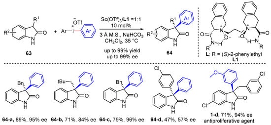- Guo, J.; Dong, S.; Zhang, Y.; Kuang, Y.; Liu, X.; Lin, L.; Feng, X. Chiral scandium(III)-catalyzed enantioselective α-arylation of N-unprotected 3-substituted oxindoles with diaryliodonium salts. Angew. Chem. Int. Ed. 2013, 52, 10245–10249. [Google Scholar] [CrossRef] [PubMed]