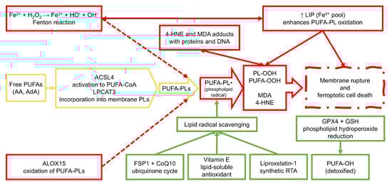 Lipid peroxidation cascade and regulatory pathways in ferroptosis. Free polyunsaturated fatty acids (PUFAs), such as arachidonic acid (AA) and adrenic acid (AdA), are activated by acyl-CoA synthetase long-chain family member 4 (ACSL4) and incorporated into membrane phospholipids (PLs) via lysophosphatidylcholine acyltransferase 3 (LPCAT3), forming PUFA-containing PLs (PUFA-PLs). These are oxidized by lipoxygenases (e.g., ALOX15) or non-enzymatically via hydroxyl radicals (•OH) generated through the Fenton reaction involving ferrous iron (Fe2+), producing phospholipid radicals (PUFA-PL•) and lipid hydroperoxides (PL-OOH, PUFA-OOH). Toxic by-products such as malondialdehyde (MDA) and 4-hydroxynonenal (4-HNE) cause membrane rupture and ferroptotic cell death. Cells counteract ferroptosis using antioxidant defenses. Glutathione peroxidase 4 (GPX4), in the presence of glutathione (GSH), reduces lipid hydroperoxides to non-toxic PUFA alcohols (PUFA-OH). Additional protection is provided by radical-trapping antioxidants (RTAs), including vitamin E, ferrostatin-1, and liproxstatin-1, as well as ferroptosis suppressor protein 1 (FSP1), which regenerates reduced coenzyme Q10 (CoQ10) via the ubiquinone cycle. Abbreviations used: AA—arachidonic acid; ACSL4—acyl-CoA synthetase long-chain family member 4; AdA—adrenic acid; ALOX15—arachidonate 15-lipoxygenase; CoQ10—coenzyme Q10; Fe2+—ferrous iron; FSP1—ferroptosis suppressor protein 1; GPX4—glutathione peroxidase 4; GSH—glutathione; LIP—labile iron pool; LPCAT3—lysophosphatidylcholine acyltransferase 3; MDA—malondialdehyde; PL—phospholipid; PL-OOH—phospholipid hydroperoxide; PUFA—polyunsaturated fatty acid; PUFA-OH—detoxified PUFA alcohol; PUFA-OOH—PUFA hydroperoxide; PUFA-PL—PUFA-containing phospholipid; PUFA-PL•—phospholipid radical; RTA—radical-trapping antioxidant; •OH—hydroxyl radical; 4-HNE—4-hydroxynonenal.