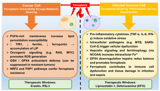 Disruptions in iron metabolism, whether driven by oncogenic signals or inflammatory responses, act as potent amplifiers of ferroptosis susceptibility by expanding the LIP and intensifying oxidative pressure on cellular membranes [148]. In cancer, this dysregulation arises from metabolic adaptations that support proliferation but inadvertently prime tumor cells for ferroptotic death [149]. In contrast, infection-induced iron retention, while part of an antimicrobial defense, can have collateral effects that promote ferroptotic injury in host tissues [150].