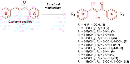 The chalcones were rationally designed to incorporate a boronic acid moiety into the B-ring, strategically positioned at either the meta or para position relative to the α,β-unsaturated carbonyl system, in accordance with the design strategy previously established by our group [23]. Furthermore, a variety of substituents were introduced into the A-ring to investigate their potential to enhance cytotoxic activity against cancer cells (Figure 1). Although prior studies have explored boronic acid substitution on both the A-ring and B-ring, findings by Kong et al. (2009) indicate that cytotoxic effects were more pronounced when the boronic acid was introduced into the B-ring [27]. To evaluate the significance of the boronic acid moiety for the molecule’s activity, compound 1 was designed without this functional group.