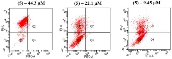 Annexin V-FITC/PI analysis of chalcone 5 carried out at three different concentrations: 44.3 μM, 22.1 μM, and 9.45 μM. Q1: Early necrotic cells; Q2: Late apoptotic cells; Q3: Viable cells; Q4: Early apoptotic cells.