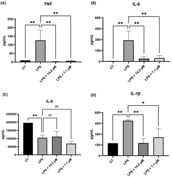 Evaluation of chalcone 5 in reducing levels of (A) TNF, (B) IL-6, (C) IL-8, and (D) IL-1β in LPS-stimulated THP-1 cells at two different concentrations. Control (CT) = THP-1 cells not stimulated with LPS. * p < 0.05, ** p < 0.01, ns = not significant.