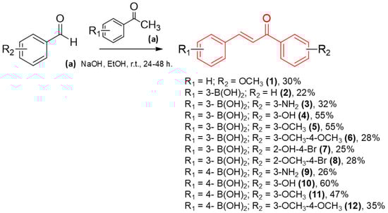 In a 10 mL round-bottom flask, a 1M NaOH solution in ethanol (96%) was prepared, followed by the addition of the respective functionalized ketones (1 eq.). Subsequently, the corresponding aldehydes (1 eq.) were dissolved in 4 mL of ethanol and added dropwise to the reaction mixture. The reaction was stirred at room temperature for 24 to 48 h. Reaction progress was monitored by TLC, using hexane and acetate as the mobile phase and UV light (254 nm) until consumption of the reagents indicated completion. At the end of the reaction, the pH of the reaction mixture was adjusted using a 10% hydrochloric acid (HCl) solution and poured into an ice bath. The formed precipitate was kept refrigerated overnight. The precipitate was then filtered using a Büchner funnel and washed with cold water. The resulting residues were purified by flash column chromatography (eluent n-hexane/AcOEt). Compounds were individually evaluated to determine the optimal mobile phase. After purification, products (1–12) were obtained, with yields ranging from 20% to 60%.