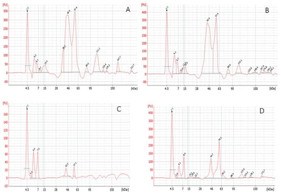 The glutenin subunits of 43–66 kDa were detected in both gluten samples (Figure 1C,D), while more intensive peaks (20–220 FU) of those proteins were detected in gluten GI94 (Figure 1C), and glutenin subunits of 16–22 kDa and proteins with an MW between 90 and 172 kDa were detected additionally in the gluten GI71 (Figure 1D), indicating lower quality. Also, the HMW to LMW-GLN subunits ratio of 0.11 and 0.48, respectively, in these gluten samples confirmed the higher quality of gluten GI94 compared to GI71.