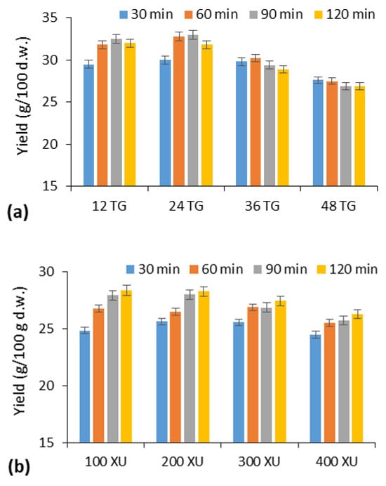 The highest gluten yield (29.42 g/100 g) was obtained after 90 min of hydrolysis using an amount of SH corresponding to 200 XU/100 g flour (Figure 2b). However, in this case, the gluten yield increased by 19% compared to the control sample, but the gluten obtained had a lower GI (96.8%) than when TG was used. Higher enzyme activities of SH and longer treatment time reduced both the gluten yield and the GI values (Figure S1).