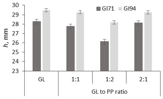 The effect of ultrasound on h parameter (measured after 150 s of processing) of different gluten (GL) and its blends with pea protein (GL-PP) at different ratios. GL—18% concentration gluten gel; GI71, GI94—commercial gluten samples of different gluten index (GI) values.