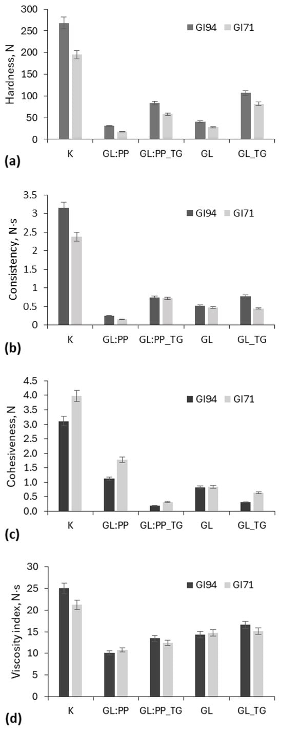 The texture of GL-PP gels was evaluated based on their strength, viscosity, elasticity, homogeneity, and stability (Figure 4). The obtained results showed that, in all cases, the GI94 gluten gels exhibited greater hardness and consistency compared to the GI71 gluten gels.