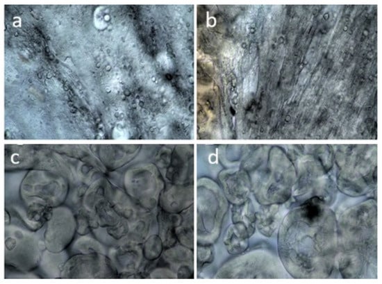 Microscopic analysis of gels, formed after ultrasound pretreatment of 18% gluten–pea protein suspensions. Gels: gluten (a); gluten treated with transglutaminase (TG) (b); gluten–pea protein (c); gluten–pea protein treated with TG (d).