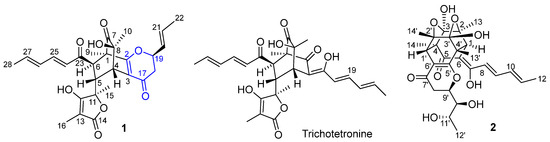 A detailed analysis of the NMR data (Table 1) revealed that 1 was an analog of trichotetronine [29,30,31], as they showed similar NMR resonances, except for the lack of one olefinic double bond compared to the latter, while containing additionally one oxymethine group (C-19: δC 83.1; δH 4.92) and one methylene group (C-18: δC 42.1; δH 2.90, 2.43 each dd).
