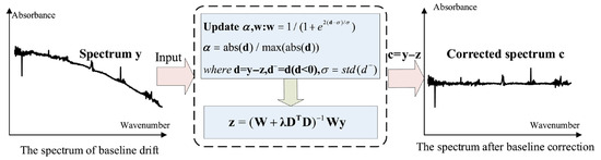 Spectral baseline drift is a common issue in gas analysis using Fourier Transform Infrared (FTIR) spectrometer, primarily caused by environmental variations during spectral acquisition. For example, fluctuations in the temperature of the infrared light source can lead to baseline shifts of varying magnitude. Likewise, angular deviations of the moving mirror during interferometric scanning may introduce baseline distortions in the resulting interferogram. Such baseline variations alter the absorbance values of specific spectral features, which serve as critical parameters in the quantitative analysis of gas mixtures. Consequently, uncorrected baseline drift can result in significant inaccuracies or even erroneous concentration estimations. Therefore, accurate baseline correction and identification of distorted spectra are essential to ensure the reliability of the analytical results. In this study, an adaptive penalized least squares method with a smoothness parameter (asPLS) is applied correct baseline drift in the absorption spectra of coal mine gases [20]. The baseline correction procedure is illustrated in Figure 2.