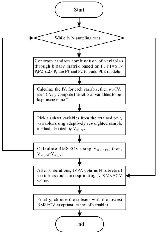Infrared spectral data typically comprise numerous variables, some of which are irrelevant or may interfere with accurate analysis. For gases with distinct absorption peaks, satisfactory results can often be achieved by selecting a single spectral line corresponding to the main absorption peak. Linear or nonlinear regression techniques can then be applied for quantitative analysis. However, when there is significant overlap in the absorption spectra between gases, randomly selecting a few variables not only increases cross-sensitivity to other components but may also reduce the prediction accuracy for the target component. Therefore, spectral variable feature selection is crucial for reducing model computation time, improving prediction accuracy, and minimizing cross-sensitivity to other components. Here, spectral variables represent absorbance values at specific wavenumbers. In this study, based on the infrared spectral distribution characteristics of coal mine gases, the entire absorption spectrum was divided into regions of distinct absorption peaks and overlapping absorption peaks. In the overlapping absorption regions, variable selection was performed using a wavelength selection method based on the Impact Value of Variables and Population Analysis (IVPA) [21]. The schematic diagram of the IVPA algorithm is presented in Figure 3.