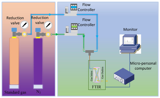Step 4, record the analysis results of each measurement, repeat 10 sets of scanning for standard gas, and calculate the repeatability of the analyzer with the analysis results of 10 sets of data. The target gases include the 11 kinds of gases (CO, CO2, C2H4, C2H2,s C3H6, SF6, CH4, C2H6, C3H8, n-C4H10, and i-C4H10). Each gas concentration is set to 100 ppm, 200 ppm, 500 ppm, 1000 ppm, 2000 ppm, 5000 ppm, 10,000 ppm, 20,000 ppm, 50,000 ppm, 70,000 ppm, 100,000 ppm, 200,000 ppm, and 300,000 ppm, according to the detection limit requirements. The experimental procedure is illustrated in Figure 4.