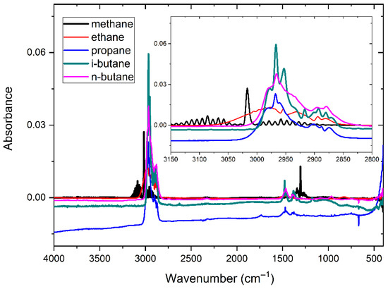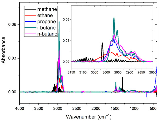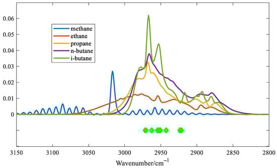 Figure 5 displays the absorbance spectra of five alkane components at 500 ppm: CH4, C2H6, C3H8, i-C4H10, and n-C4H10. It is evident that the absorption peaks of the five gases are highest near the wavenumber of 3000 cm−1, which is the main absorption peak of alkane gases, and in the range of 1200–1700 cm−1, the secondary absorption peak of alkane gases can be found. Significant spectral overlap among the five gases can be observed in both the primary and secondary absorption regions.