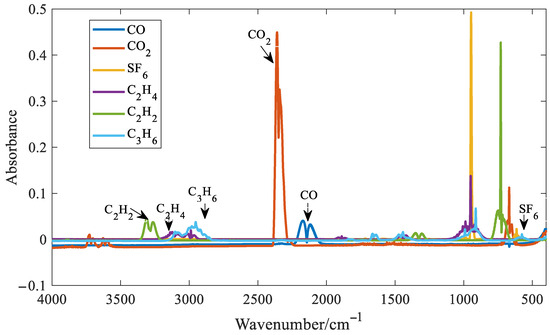 For gases with distinct absorption peaks, such as CO, CO2, SF6, C2H4, C2H2, and C3H6, the distinct absorption peaks and troughs were selected for quantitative analysis. The absorbance spectra of the six gases are shown in Figure 8. In the figure, the concentration of SF6 is 500 ppm, the concentration of CO is 7000 ppm, the concentration of CO2 is 5000 ppm, and the concentration of the other three gases is 3000 ppm.
