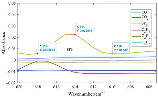 It can be seen from Figure 8 that distinct absorption peaks are present for all six gases. It can also be observed that SF6 exhibits the highest absorbance around 1000 cm−1. At the same concentration, its absorption coefficient is approximately one order of magnitude higher than those of the other five gases. As a result, SF6 has the lowest detection limit among the six gases analyzed. Although SF6 shows strong absorbance near 1000 cm−1, this region suffers from significant spectral overlap with C2H4 and C3H6, making it unsuitable for accurate feature extraction. Fortunately, SF6 also presents a distinct but weak absorption peak at 614 cm−1. Therefore, the absorbance at this wavenumber was chosen as the characteristic variable for SF6 in the quantitative model. Taking SF6 as an example, six quantitative methods for gases with distinct absorption peaks were introduced. Three spectral points around the distinct absorption peak of SF6 at 614 cm−1 were selected, as shown in Figure 9.