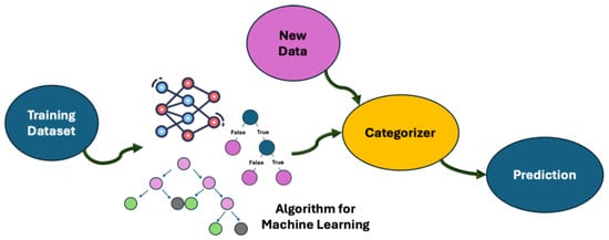 During the design of a new material, many limitations or constraints can be found; thus, ML is often employed to overcome these adverse factors. In this context, supervised learning is identified as the most representative form of ML [33]. This learning approach involves two steps: the algorithm reveals patterns in the training dataset, which may consist of labels or sample sets, and then it converts patterns into a mathematical function, namely the model, during the training stage. Supervised learning models are generally implemented for predictions about samples that the models have not encountered in the inference stage [34]. To give an example, a typical learning task, following a supervised approach, is the classification problem, in which the learner approximates the behavior related to a function [35]. Training and test stages represent the crucial points of an ML process. In the training phase, the algorithm is built by the exploitation of examples gathered from the training dataset as input, so the acquisition of features from the learner or learning model can take place. Once labeled data are available for training, supervised learning can be applied, for example, in regression (e.g., predicting the prices of products on the market) and classification (e.g., image classification) tasks [36]. The training of linear regression, decision trees (DTs), support vector machines (SVMs), logistic regression, random forests (RFs), and neural network (supervised ones) algorithms is performed on labeled data, thus learning the mapping between the input parameters and their related outputs (see Figure 2) [33].