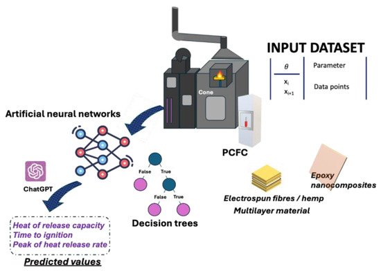Another interesting application of AI/ML tools refers to electrospinning and sol-gel-derived nanostructures, which can be used to develop polymeric nanofibers with several functional properties. In this context, Bifulco et al. prepared a multilayer material made of coated hemp blankets with cross-linked electrospun polyvinylpyrrolidone-silica blankets and TiO2 nanoparticles (Figure 4) [85]. This MM showed good tensile properties and could work not only as a smoke suppressant but also as a fireproof fabric. The assessment of the fire properties is usually time-consuming and requires the preparation of a huge number of precious samples. Despite the incomplete input dataset consisting of fire parameters related to sol-gel-treated textiles, and thanks to the support of ChatGPT (GPT-4o version), the research group implemented ANNs and decision trees to predict the time to ignition (TTI) and the pkHRR of the MM. The accuracy of the prediction was evaluated by the calculation of MAPE values, considering the experimental data and the predicted values. Decision trees gave MAPE values of 0.431 (~43%) and 0.336 (~34%) for TTI and pkHRR, respectively. Conversely, MAPE values assessed by the outputs of ANNs were 0.468 (~47%) for the TTI parameter and 0.404 (~40%) for the pkHRR parameter [85]. Based on these results, for both algorithms, a reasonable predictive capability was found [86]. However, decision trees provided the lowest MAPE values, hence becoming preferable and more reliable in case of some missing input data.