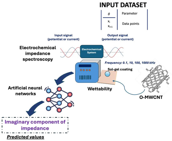 Many sol-gel techniques can be employed for the manufacturing of coatings able to confer very low wettability and chemical resistance to different substrates [89]. To give an example, in the oil and gas sector, the wettability of surfaces in pipelines affects the corrosion rates; therefore, several strategies are usually adopted to limit the occurrence of material deterioration phenomena [90]. Akbarzadeh et al. obtained sol-gel coatings starting from TEOS, methyltriethoxysilane, and glycidoxypropyltrimethoxysilane as precursors (Figure 5) [91]. The research group incorporated different amounts of oxidized multi-walled carbon nanotubes (O-MWCNTs) to modify the corrosion resistance properties and hydrophobicity, and increase the barrier effect of the silane-based nanocomposite coatings, also checking the performance through electrochemical impedance spectroscopy and wettability measurements. By using a single hidden-layer perceptron and the Levenberg–Marquardt algorithm optimization procedure as a learning algorithm, an ANN model was constructed to predict the imaginary part of the impedance [91]. The immersion time of mild steel panels in the sol-gel silane solution by dip-coating, the different loadings of O-MWCNT in the solution, and the real part of the impedance were implemented as input data. The accuracy of the optimized model was calculated by comparing the experimental data with the predicted parameters. High O-MWCNT loadings in the silane-based coatings resulted in a decrease in the corrosion current density, as confirmed by polarization curves and AC impedance spectra. The ANN model demonstrated highly reliable predictive efficiency, as the statistical errors, including MSE and MAE, were 0.00099606 and 0.0106, respectively. Also, the R2 value was found to be around 0.9879, revealing the absence of scattering in the entire data prediction range [91].