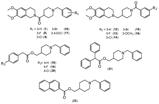3.1.7. General Procedure for the Synthesis of 2-Phenylacetate of (1-Benzylpiperidin-4-yl)methyl Derivatives (18–20), 2,2-Diphenylacetate of (1-Benzylpiperidin-4-yl)methyl (21) and 2-Naphthoate of (1-Benzylpiperidin-4-yl)methyl (22)