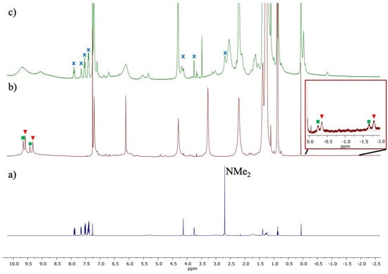 1H NMR spectra of the following: free complex 3 (a); encapsulated complex 3 (3⊂16; with 3⊂16(8-H2O) red triangle and 3⊂16(15-H2O) green square) (b); after addition of NEt4Cl to 3⊂16 with signals from free 3 marked X (c).