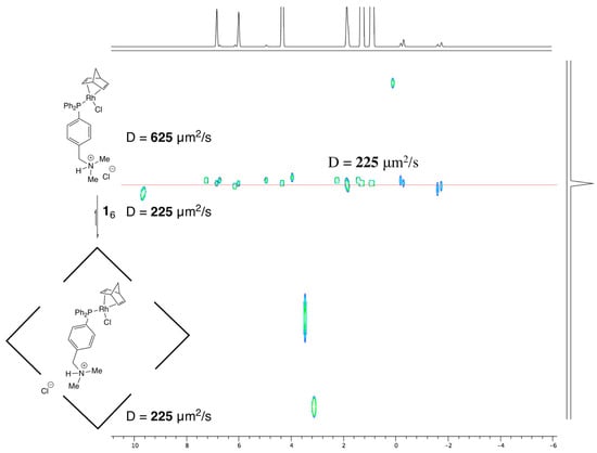 Additionally, signals in the negative part of the 1H NMR spectrum were also observed in the DOSY NMR experiment. The analysis revealed the presence of a single species attributed to the inclusion complex 3⊂16 (diffusion coefficient 225 μm2s−1; hydrodynamic volume 18,800 Å3; Figure 4). This value was found to be equivalent to that of capsule 16 (225 μm2s−1; hydrodynamic volume 18,800 Å3) and distinctly different from that of “free” complex 3 (diffusion coefficient 625 μm2s−1; hydrodynamic volume 877 Å3). It was determined that the presence of capsule 16 results in the absence of signals corresponding to “free” complex 3. Given the finding that the values of hydrodynamic volumes 16 and 3⊂16 were identical, it could be deduced that the encapsulation of 3, with an estimated volume of 610 Å3 and an occupancy factor of the inner cavity of 44%, close to the ideal value of 55 ± 9% [45], did not result in substantial modification of the structure of the supramolecular capsule.