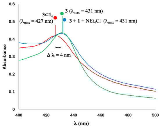The formation of the inclusion complex was subsequently confirmed through the utilization of UV-visible spectroscopy (Figure 5). The maximum of the extinction coefficient of complex 3 (λ = 431 nm) underwent a weak bathochromic effect of 4 nm by the addition of 16 (λ = 427 nm), in agreement with the formation of an encapsulation phenomenon (3⊂16) [23,24,25,40]. The release of 3 in solution by the addition of NEt4Cl was also confirmed by an absorbance maximum corresponding to the free complex (λ = 431 nm), once again demonstrating the reversibility of the encapsulation of complex 3 in the hexameric capsule 16.