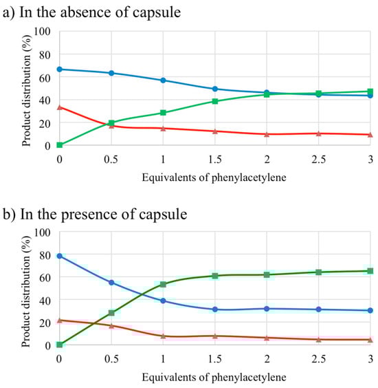 Subsequently, an investigation was conducted into the impact of the phenylacetylene 5a equivalent number on this reaction. Consequently, the unencapsulated complex 3 was initially assessed (Figure 6a). The predominant formation of homocycloaddition product 7 was observed for stoichiometry below two equivalents of 5a. At the critical value of two equivalents of 5a, a similar formation of product 7 and the product of interest, 6a, was obtained (46% and 44%, respectively). At higher stoichiometries, the 6a product exhibited a marginal predominance. The bishomocycloaddition product 8 was observed in the minority under different conditions (for one equivalent of 5a: 15% formation of 8, for three equivalents of 5a: 9% formation of 8).