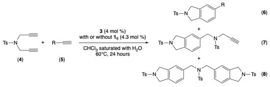 Under argon, the rhodium complex (3) (2.4 mg, 4 µmol, 4 mol %) was dissolved in H2O-saturated CHCl3 (1 mL). When necessary, resorcinarene (1) (28.7 mg, 26 µmol, 26 mol %) was added and the resulting solution was stirred at room temperature for 0.5 h. Then, N,N-dipropargyl-p-toluenesulfonamide (4; 24.7 mg, 100 µmol) and the corresponding amount of the desired alkyne were added. The reaction mixture was heated at 60 °C for 24 h. An aliquot of the solution was analyzed by 1H NMR. The products were unambiguously identified by 1H and 13C{1H} NMR after their isolation by flash chromatography on silica gel (eluent: petroleum ether/AcOEt: 7/3 v/v) (see Supplementary Materials).