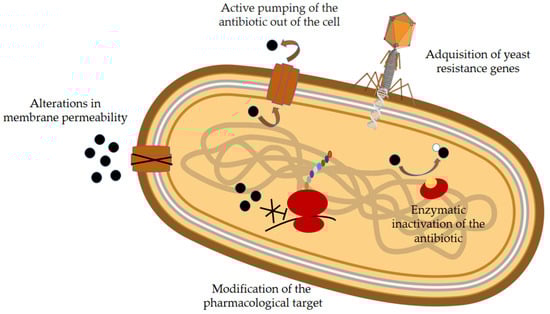 The main causes of antibiotic resistance are the excessive and inappropriate use of antibiotics in humans and livestock, and the lack of precautions in hospitals, which results in healthcare-associated infections [3]. There are two types of bacterial resistance mechanisms: intrinsic and extrinsic. Intrinsic mechanisms are determined by the characteristics of each bacterium, while extrinsic mechanisms result from changes in the genome of these microorganisms due to mutations or the acquisition of exogenous DNA [6]. A thorough description of these processes can be found in several revisions, including those of Martinez (2014) [7] and Gillings et al. (2017) [8]. These mechanisms include modification of the pharmacological target, alterations in membrane permeability, active pumping of the antibiotic out of the cell, enzymatic inactivation, biofilm formation, and acquisition of resistance genes (Figure 1 and Table 1).