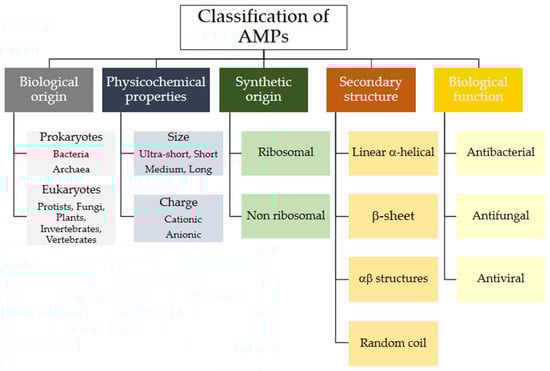 Various criteria can be used to classify natural AMPs. The APD classifies them by biological origin, physical and chemical properties, biosynthetic origin, biological function, types of covalent bonds formed, three-dimensional structure, biological target, and mechanism of action (see Figure 3). Below is a brief review of some of these aspects. The following sections will classify AMPs according to their origin, whether biological or synthetic [33].