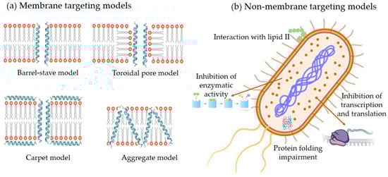 Cationic AMPs exert their activity by interacting with microbial cell membranes, and this interaction is strongly influenced by the membranes’ lipid composition. Because bacterial membranes are the primary targets of AMPs, bacteria find it more difficult to develop resistance to these drugs than to conventional antibiotics. As previously mentioned, electrostatic interactions between AMPs and negatively charged microbial surfaces are crucial. Teichoic acids in the cell wall of Gram-positive bacteria and LPS in the outer membrane of Gram-negative bacteria give their surfaces a negative charge, which strengthens the interaction with AMPs. In contrast, the outer layer of eukaryotic membranes is neutral at physiological pH because it consists mainly of phosphatidylcholine and sphingomyelin. Thus, this interaction is not favored [20]. Numerous articles and reviews in the literature describe the mechanisms of action of AMPs [47,48,49,50,51,52]. In general, two types of strategies can be distinguished (Figure 5): (a) membrane-directed mechanisms and (b) non-membrane-directed mechanisms. Type (a) proposes that the bactericidal effect of AMPs results from their interaction with the membrane, increasing its permeability, and ultimately lysing the membrane and releasing cellular contents. Depending on whether or not pores are present in the membrane following this mechanism, we can differentiate between transmembrane pore models (barrel-stave model and toroidal-pore model) and non-porous models (carpet model and aggregate model). According to the barrel-stave model, AMPs with an amphiphilic structure aggregate on the bacterial cell membrane as a barrel-shaped plate around its axis. This forms transmembrane pores that allow the filtration of cellular contents, ultimately leading to cell death. According to the toroidal-pore model, AMPs aggregate in the cell membrane to form a pore. They act as the outer ring, and the phospholipid head acts as the inner ring. This ultimately leads to the leakage of intracellular material. In the carpet model, AMPs spread across the cell membrane surface. When they reach a certain concentration, they destroy the membrane’s structure, causing leakage of cellular contents. Those acting according to the aggregate model insert themselves into the cell membrane through hydrophobic interactions, rupturing it and causing cell death in a manner similar to how detergent dissolves fat [52]. Two types have also been identified in non-membrane-targeted mechanisms (Figure 5b): cell wall-targeting and intracellular targeting. In the former, Lipid II is the key element to which AMPs bind by recognizing its structural domain. This creates a spatial barrier that obstructs cell wall synthesis. This interaction causes membrane perforation, resulting in morphological abnormalities and, ultimately, bacterial lysis. Some AMPs, such as nisin, exhibit “dual-mechanism synergistic sterilization”. The N-terminal ring of this AMP binds specifically to the pyrophosphate group of Lipid II, which effectively inhibits transglycosylase activity. Meanwhile, the C-terminus inserts into the cell membrane to form pores. Intracellular targeting mechanisms involve AMP penetration into the cytoplasm and interaction with various intracellular targets. These interactions interfere with the essential cellular activities necessary for achieving biological effects, including DNA and RNA synthesis, protein folding, and enzymatic activity [20,48,52,53,54,55].