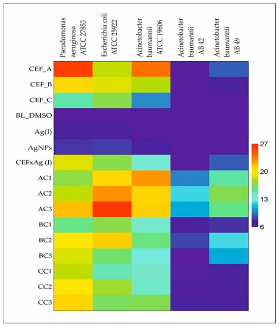 Heat map of mean inhibition area of selected antimicrobial agents used externally on bacterial strains using the disk diffusion method. Notation: CEF—cefiderocol, CEF_A—CEF at initial concentration 1.5 mg/mL; CEF_B—CEF at initial concentration 0.15 mg/mL; CEF_C—CEF at initial concentration 0.015 mg/mL, BL—blank test, DMSO—dimethyl sulfoxide, Ag(I)—silver ions, AgNPs—silver nanoparticles, AC1—CEF concentration 0.75 mg/mL + AgNPs (1 mM), AC2—CEF concentration 0.75 mg/mL + AgNPs (0.5 mM), AC3—CEF concentration 0.75 mg/mL + AgNPs (0.25 mM), BC1—CEF concentration 0.075 mg/mL + AgNPs (1 mM), BC2—CEF concentration 0.075 mg/mL + AgNPs (0.5 mM), BC3—CEF concentration 0.075 mg/mL + AgNPs (0.25 mM), CC1—CEF concentration 0.0075 mg/mL + AgNPs (1 mM), CC2—CEF concentration 0.0075 mg/mL + AgNPs (0.5 mM), CC3—CEF concentration 0.0075 mg/mL + AgNPs (0.25 mM)).