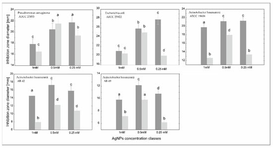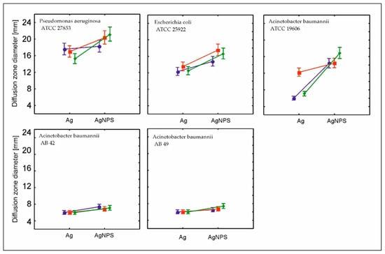 Mean ± confidence interval of the diameter of the bacterial growth inhibition zone in relation to the applied concentration of silver and silver nanoparticles (navy blue—1 mM, red—0.5 mM, green—0.25 mM). (PA ATCC 27853—Pseudomonas aeruginosa, AB ATCC 19606—Acinetobacter baumannii, EC ATCC 25922—Escherichia coli, AB 42—Acinetobacter baumannii (clinical strain), AB 49—Acinetobacter baumannii (clinical strain)).