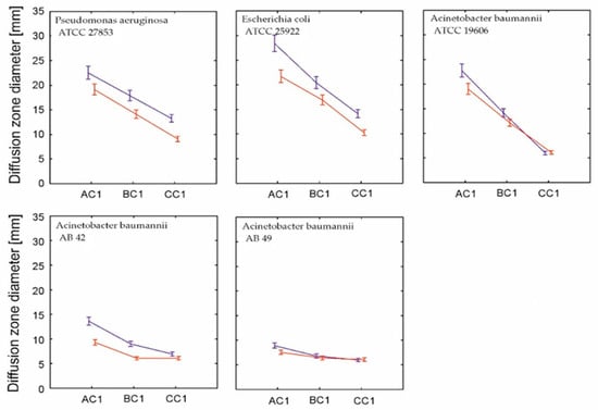 The reletionship between the mean diameter of the inhibition zone (±confidence interval) and vertical layer orientation of cefiderocol and nanosilver. (navy bluecefiderocol in direct touch to strains, red—nanosilver in direct contact with bacterial strains. AC1—cefiderocol concentration 0.75 mg/mL + AgNPs (1 mM), BC1—cefiderocol concentration 0.075 mg/mL + AgNPs (1 mM), and CC1—cefiderocol concentration 0.0075 mg/mL + AgNPs (1 mM)).