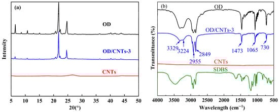 - The XRD pattern of the OD/CNTs simply represents a superposition of the individual diffraction patterns of CNTs and OD, demonstrating that only physical mixing occurs between the components without any chemical reaction.