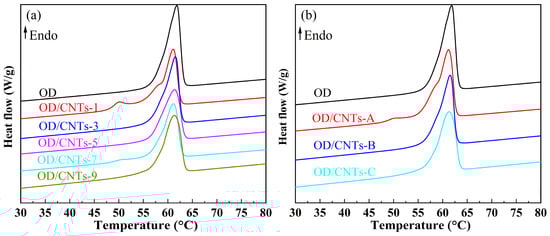- The incorporation of CNTs showed negligible effects on the melting and solidification temperatures of OD. Notably, the OD/CNTs composites maintained high latent heat values for both phase transitions. Specifically, the OD/CNTs-3 composite exhibited melting and solidification temperatures of 56.9 °C and 57.2 °C, respectively, with corresponding latent heats of 233.0 J/g and 202.9 J/g. The OD/CNTs-3 CPCMs demonstrated significant thermal enhancement, exhibiting thermal diffusivity and conductivity values 1.2 times and 1.5 times higher than pure OD, respectively.