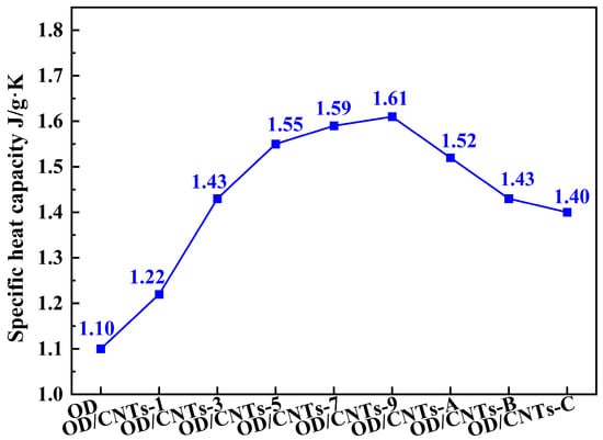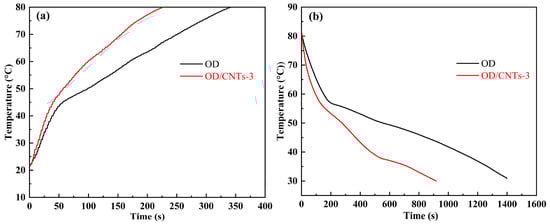- The composite showed remarkable improvements in thermal cycling efficiency, with heating time reduced by 39.7% and cooling time decreased by 43.1% compared to the OD. The CNTs formed an efficient thermal conduction network within the OD, significantly reducing both the heating and cooling durations of the PCMs.